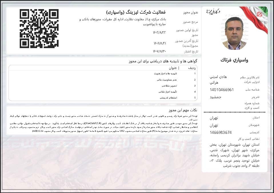 مجوز فعالیت لیزینگ فرتاک از سوی بانک مرکزی تمدید و صادر گردید